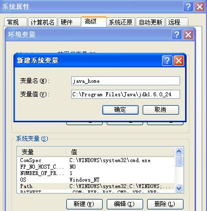 1)XP系统中,右击“我的电脑”–“属性”–“高级”–“环境变量”,如果是win7系统,那么就是右击“计算机”–“属性”–“高级系统设置”。新建一个变量名为java_home,其变量值为JDK所在的路径,如图