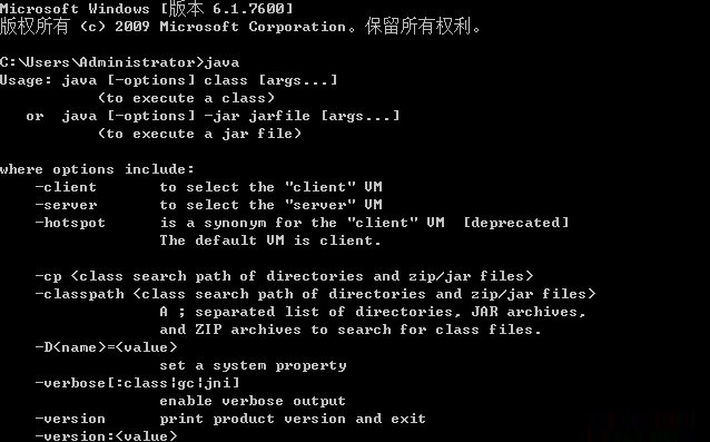 完成后,直接点击确定即可,这样就设置好了java运行环境了,如果想要测试下是否已经成功了,那么我们可以打开命令提示符,或者“运行”–“CMD”,在命令提示符中输入java或者是javac,如果看到如下图所示,则表示环境搭建成功,如果不成功,请检查JDK路径是否正确!